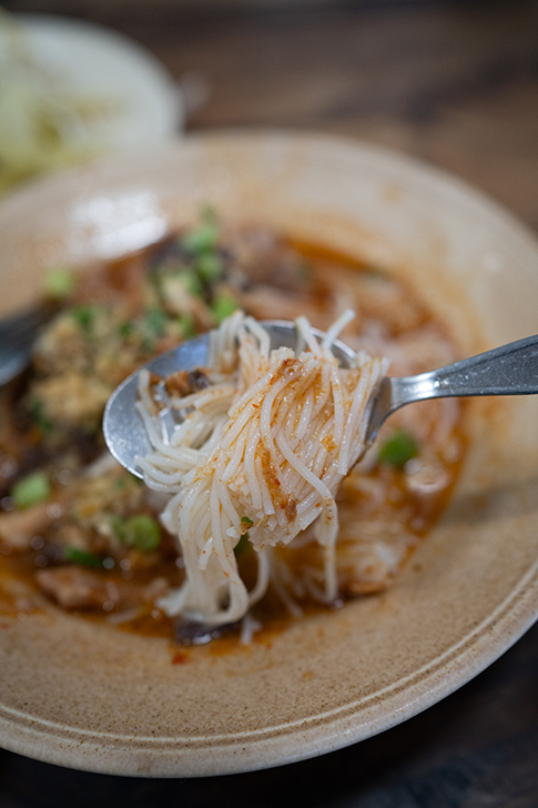 タイ北部、とくにチェンマイ周辺で親しまれてきた郷土の味で、赤く染まったスープが目を引く麺料理です。