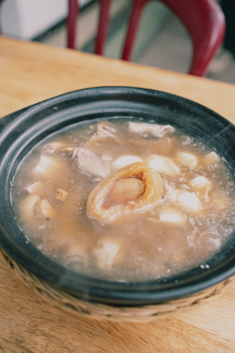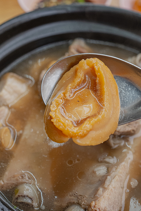 豚肉や内臓、キノコなどの具材に混ざって、堂々とアワビが一枚。