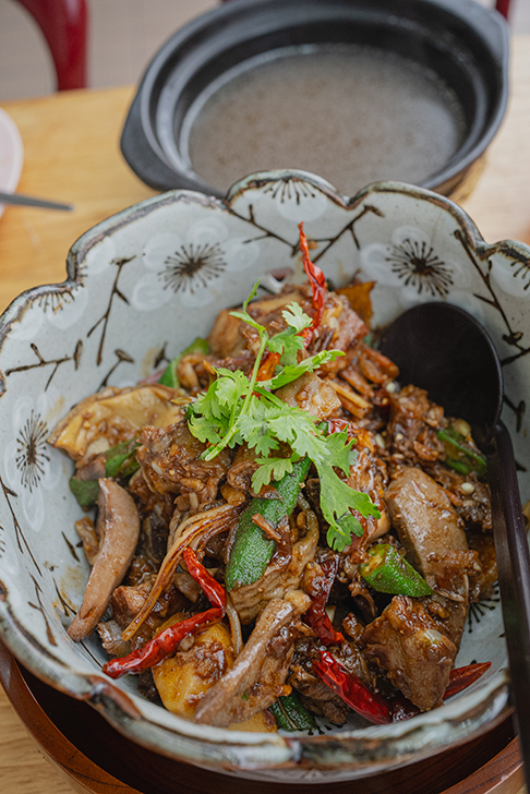 豚のホルモンを始め、オクラ、干しエビ、イカなどを、ニンニク、生姜、唐辛子、パクチーの根などと共に炒め上げたスタイルです。