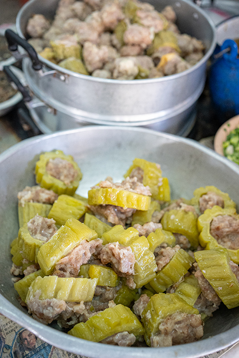 この店でも手作りのルークチンをはじめ、さまざまな具材が揃っていますが、特に目を引くのが苦瓜の肉詰め。