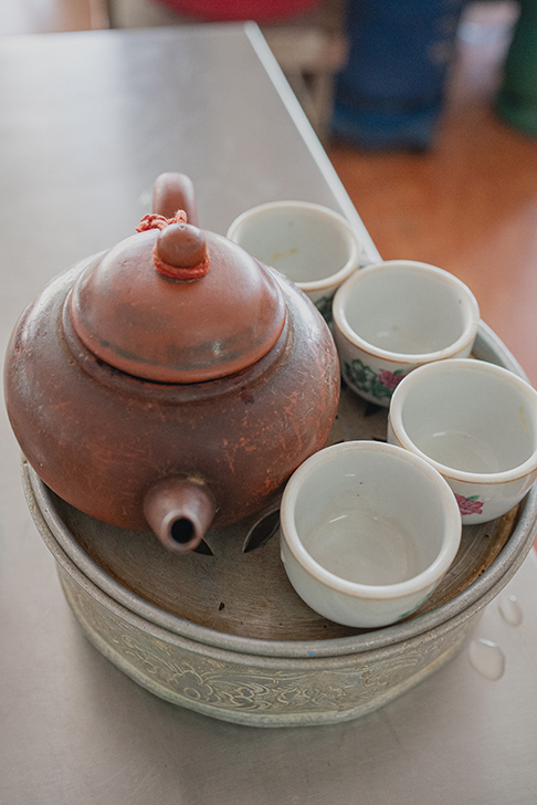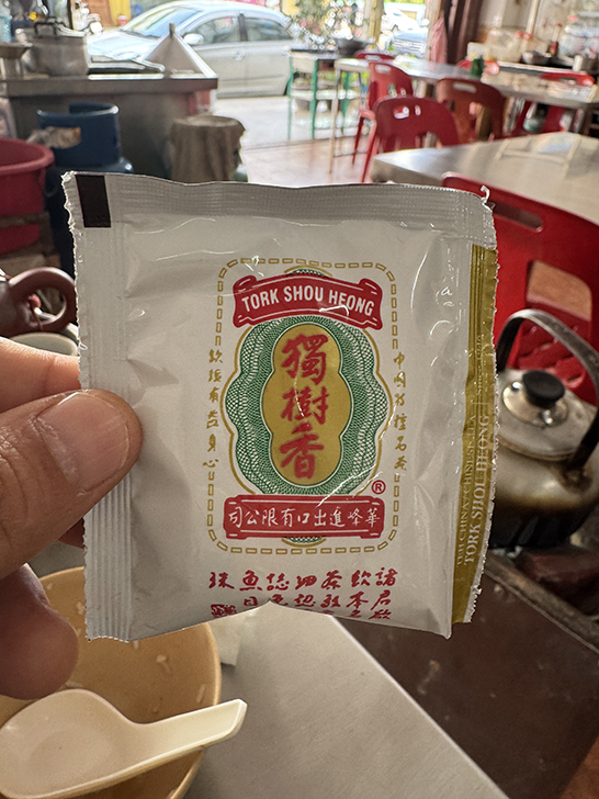 特に注文したわけではないのですが、スタッフが「獨樹香(TORK SHOU HEONG)」という個包装の茶葉と、年季の入った渋い茶瓶(急須)をテーブルに運んできてくれました。
