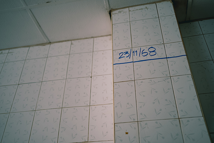 こには青いマジックで一本の線が引かれており、その横には「23/11/68」と日付が書かれている。
