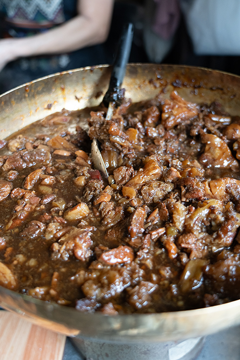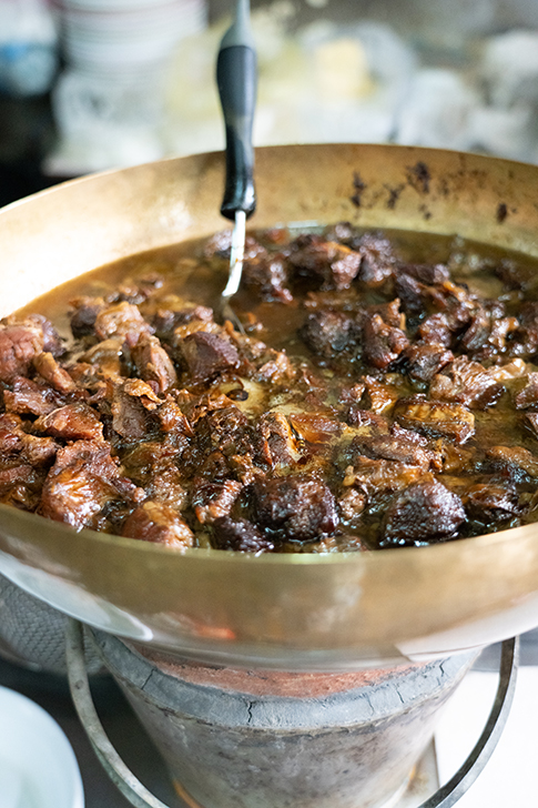 2つ並んだ鍋には、牛肉と豚肉が煮込まれていて、どっちも美味そう。