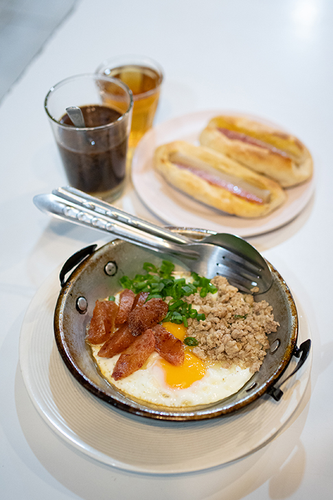 カイガタとは、小さな鉄皿に目玉焼きをのせ、ムーヨー(ベトナム風ハム)やクンチアン(中華ソーセージ)、豚ミンチなどをトッピングした朝食料理です。