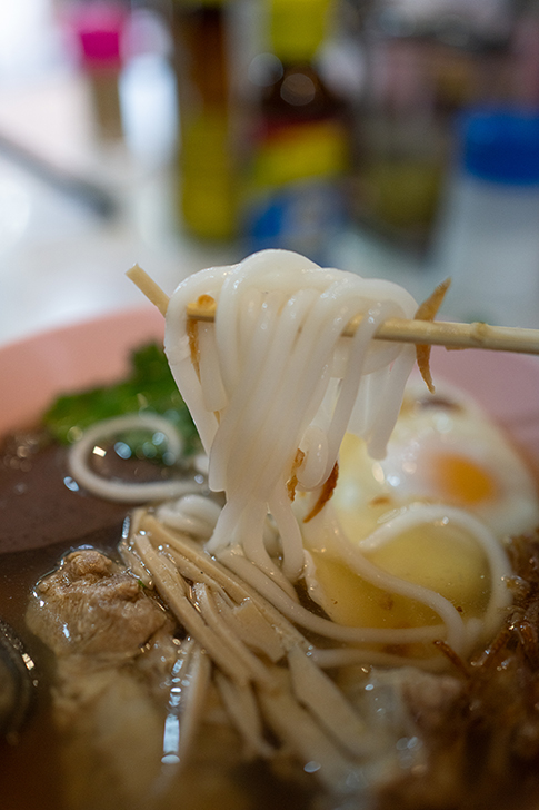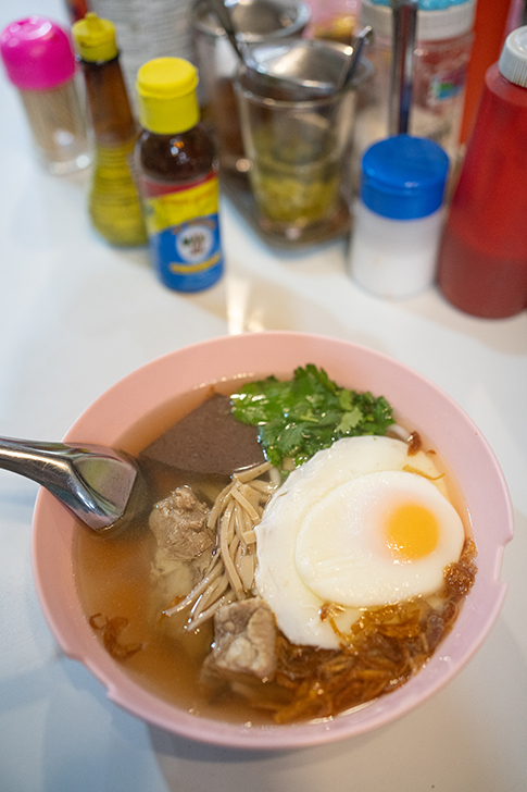 豚肉やルアット(血の豆腐)、揚げたホムデーン、ムーヨーなどがトッピングされた、基本に忠実なクイジャップユアン。