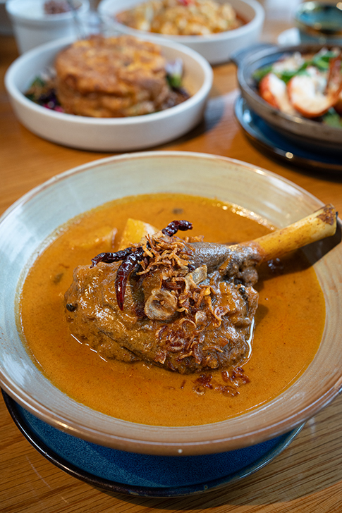 ラムシャンクを軽く焼いてから煮込むことで香ばしさと柔らかさを両立。ご飯との相性は抜群。