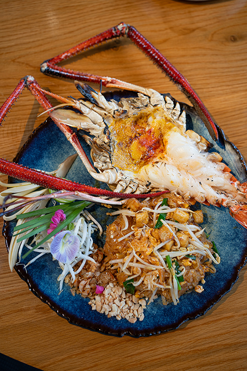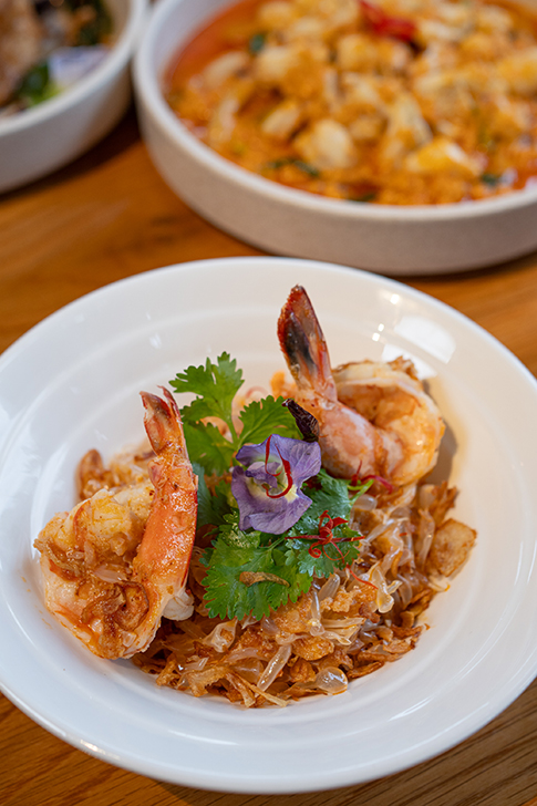 自家製“Ready to Cook”パッタイソースを使い、豪快な焼きエビと合わせた代表的な人気メニュー。