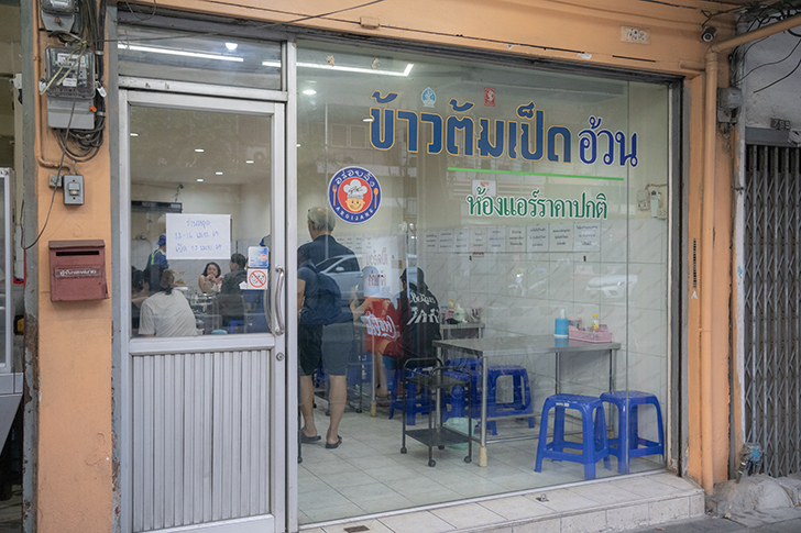 そこから西へ1分ほど歩くと、本日取り上げる『カオトムペットウアン(ข้าวต้มเป็ดอ้วน)』の外観が見えてきます。