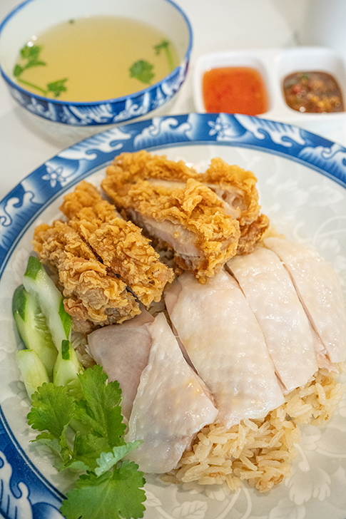 しっとりと仕上がった蒸し鶏とサクッとした衣の揚げ鶏のカオマンガイ!