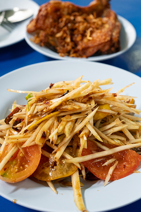 ソムタムプープラーラーは、青パパイヤをピーラーではなく包丁で刻む現地流。