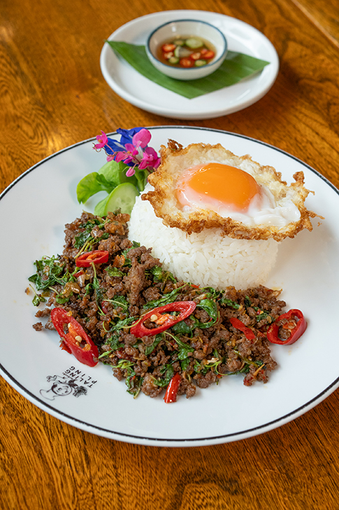 最後にいただいた「カオホームマリ ワギュー ガパオ(ข้าวหอมมะลิ เนื้อวากิวผัดกะเพรา)」は、香り高い和牛とホーリーバジルをプリッキーヌで炒めた贅沢なガパオライス。