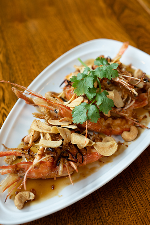 「クン・ソース・マカーム(กุ้งซอสมะขาม)」は、大きな川エビを香ばしく揚げ、甘酸っぱいタマリンドソースで仕上げた一品。