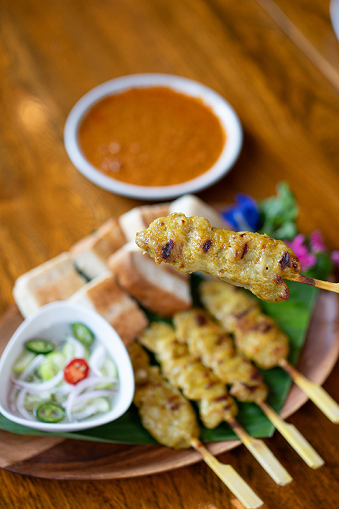 スパイスと生ココナッツミルクに漬け込んだ豚ロースを炭火で香ばしく焼き上げ、濃厚なピーナッツソースでいただく定番の一皿。