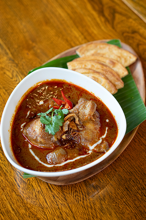 焙煎スパイスとハーブを使った自家製ペーストが主役のマッサマンカレーで、鶏もも肉をココナッツクリームとともにじっくり煮込んでいます。