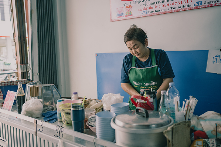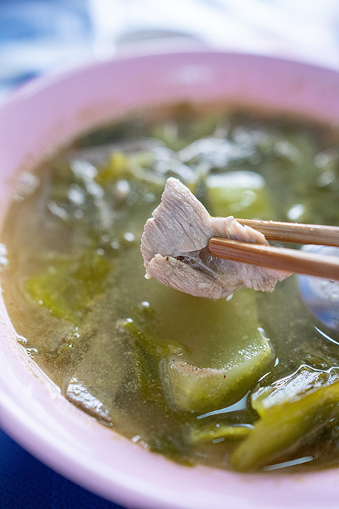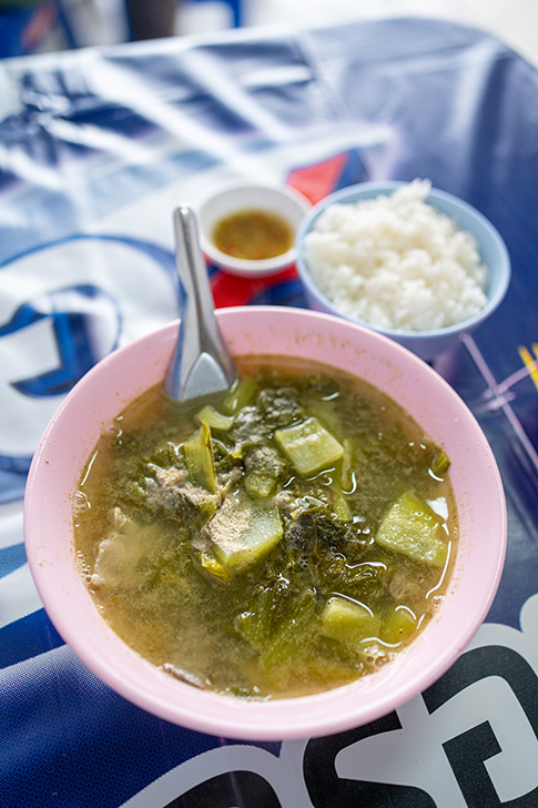 中華系の影響を受けた一杯で、丁寧に下処理された腸やレバーなどが入り、そこに「ギアムチャイ(เกี่ยมไฉ่)」と呼ばれるからし菜の漬物を加えることで、独特の酸味が生まれます。