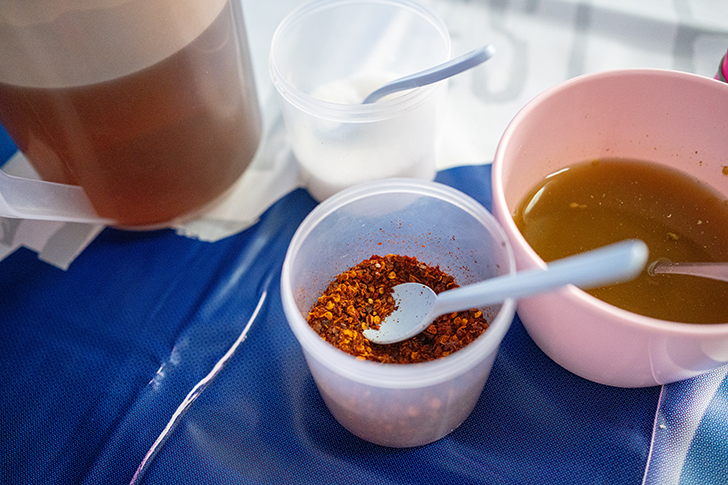 具材の腸やレバーは、小皿に合わせた調味料でいただきます。
